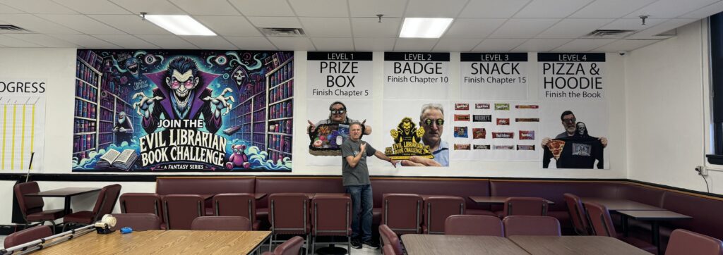 The prize for reaching Chapter 10 was earning a custom laser-cut “Evil Librarian Book Challenge” badge. The design became a student favorite, and it also tied directly into our school’s Work Experience program, where a few students learned how to use the Glowforge laser printer to help create the badges. This added a hands-on, real-world skill component to the challenge that went beyond just reading. Because of the close relationships I have with our students, my “scary” appearance only made the experience more meaningful since they knew it was all in fun and not scary at all.